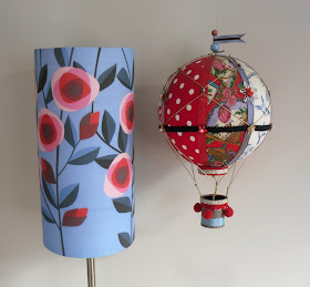 HERE ARE A COUPLE OF ITEMS I MADE A WHILE AGO. THE LAMP FEATURES A CUT PAPER COLLAGE AND THE HOT AIR BALLOON IS MADE OF FABRIC SCRAPS WRAPPED AROUND A STYROFOAM BALL.